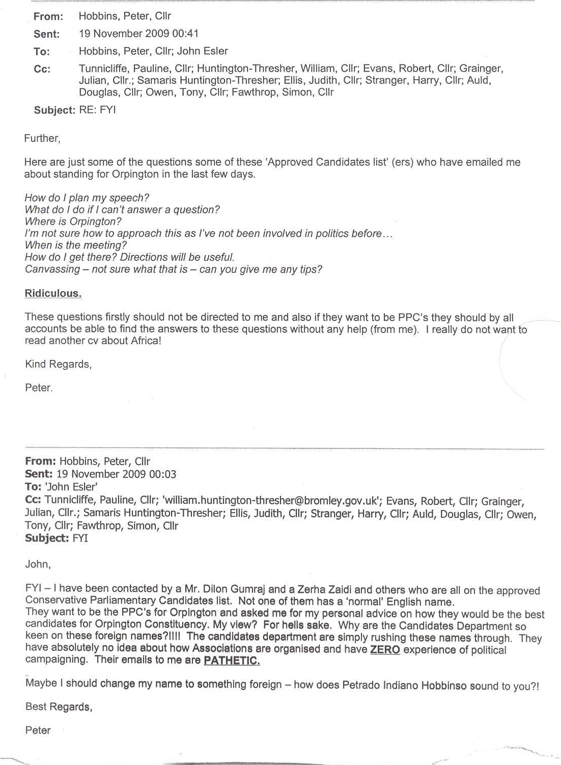 “They want to be the PPCs for Orpington and asked me for my personal advice on how they would be the best candidates for the Orpington Constituency. My view? For hells sake. Why are the Candidates Department so keen on these foreign names?!!!!”