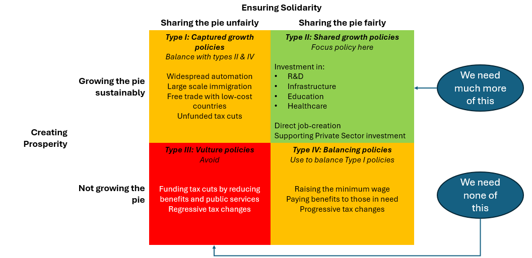 Policy formulation is complex, but there are only fundamentally four types of policy. Each policy either grows the pie or it doesn’t; and it either shares the benefits of that growth fairly or it doesn’t. That gives us four types of policy: